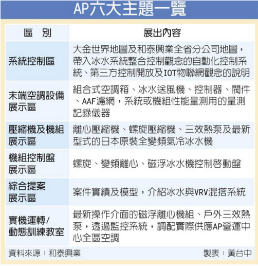 走入AP營運中心,開闊的迎賓時光廊區頓時吸引參訪者的目光,高達3層總數超過100只貨柜,建構成強烈的工業風格鋼鐵城堡。右側展示VRV及家用系統,中央主展廳則為AP系列產品的展示,展廳內分為六大主題(見右表),大金全系列商品一覽無遺。